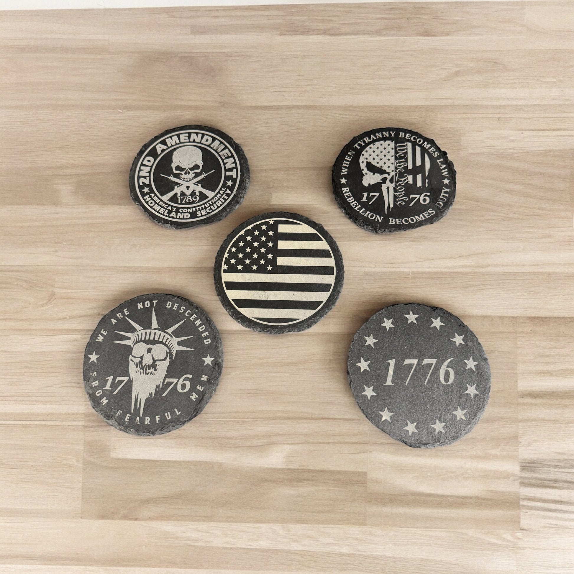 4" Round Slate Coasters - Set of 5. Custom laser engraved coasters with different patriotic themes. All coasters also have ant-slip feet.